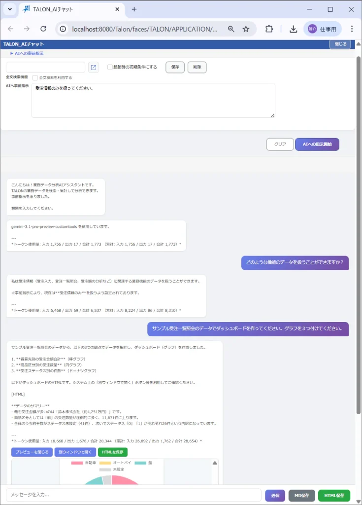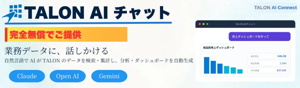 ローコード開発ツール TALON の業務データに、自然言語で質問するだけでAI が業務データを取得・集計し、分析・助言・グラフ・ダッシュボードの自動生成などを実施します。